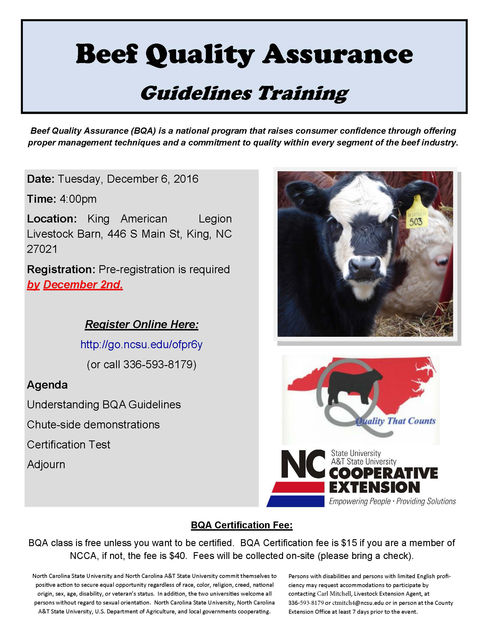 There will be a Beef Quality Assurance Training at the King American Legion Barn on December 6th at 4 PM. Beef Quality Assurance (BQA) is a national program that increases consumer confidence through offering proper management techniques and a commitment to quality within every segment of the beef industry. Please register prior to December 2nd at http://go.ncsu.edu/ofpr6y or call 336-593-8179.