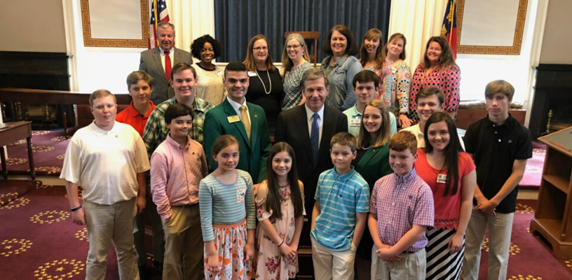 Governor Roy Cooper declared May 12 as the Youth Day of Service. Forsyth County 4-H Council President, Spencer Cook; Reporter, Ethan Cook; Secretary, Jadyn Hooker; Chaplain, Matthew Richardson, Gwenda Hooker and Angie Cook, Co-Leaders of the Trailblazers 4-H Club, Cana Hooker and Ben Cook, members of the Trailblazers 4-H Club, all attended the proclamation, along with April Bowman, 4-H Agent with the N.C. Cooperative Extension, Forsyth County Center and Aerial Woody, NCSU 4-H Summer Intern. Also pictured are 4-H members from Edgecombe County, State 4-H staff and State 4-H officers. Read the proclamation here.