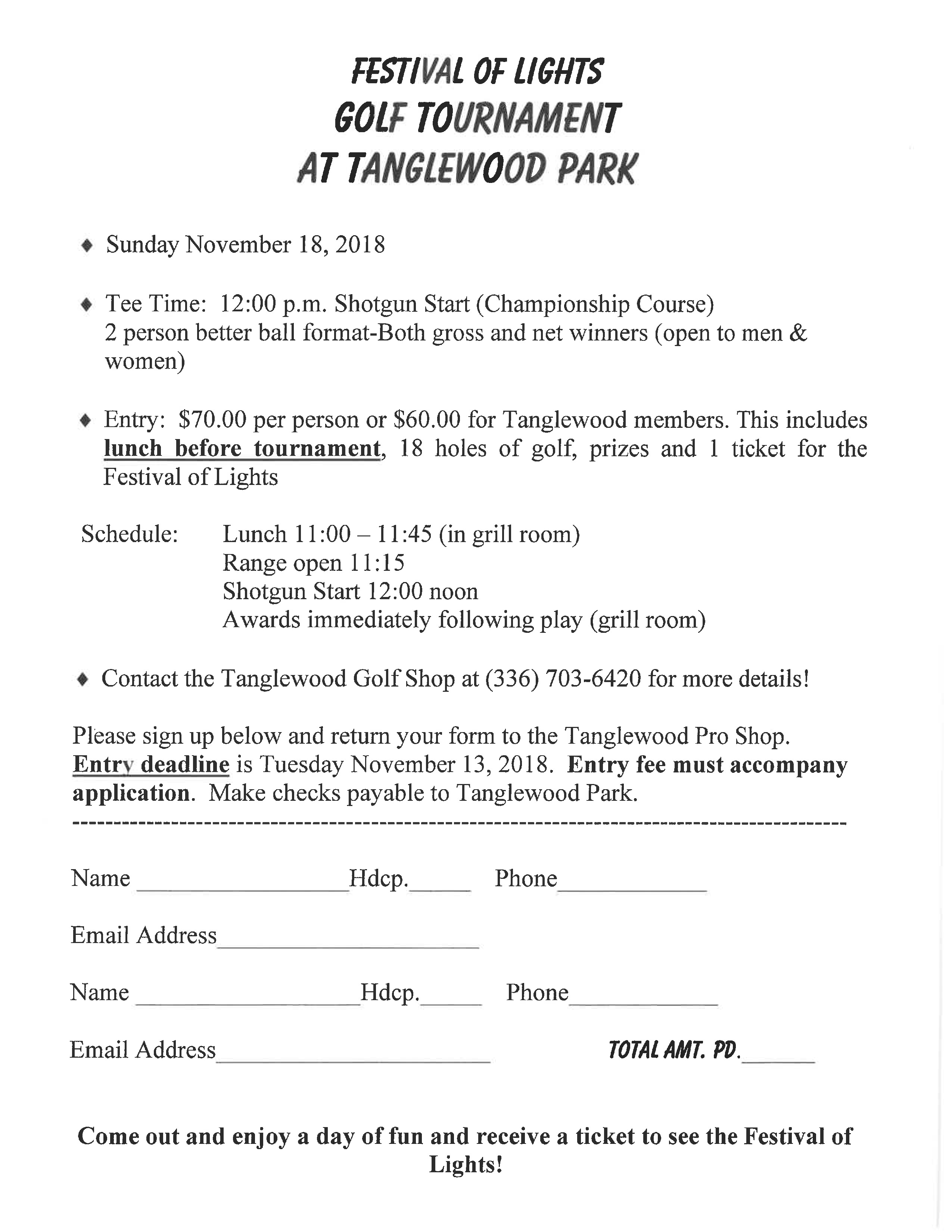 Join in the fun at Tanglewood Park's 7th annual Festival of Lights Golf Tournament on the NEWLY renovated Championship Course!