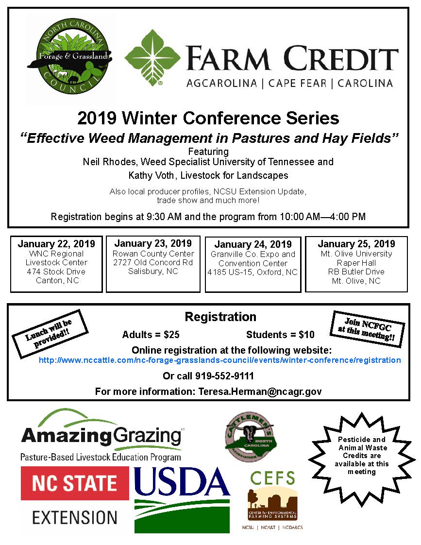 Learn about "Effective Weed Management in Pastures and Hay Fields" during the Winter Conference Series featuring Neil Rhodes, Weed Specialist at University of Tennessee, and Kathy Voth, Livestock for Landscapes. The workshop will be repeated at four locations from January 22-25. The program runs from 10 a.m. until 4 p.m. each day. Click here for locations and registration information.