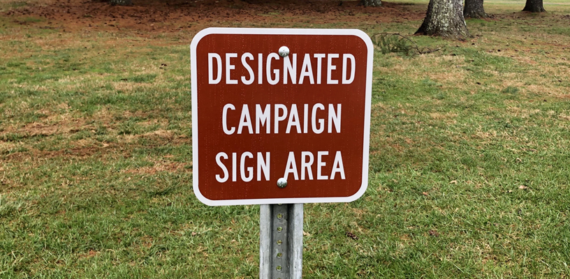 With this year's election approaching, please keep in mind that all campaign signs must be posted in the Forsyth County Park's designated areas. These areas will be marked with a brown sign that reads, "Designated Campaign Sign Area." Any signs posted elsewhere will be moved to these locations.