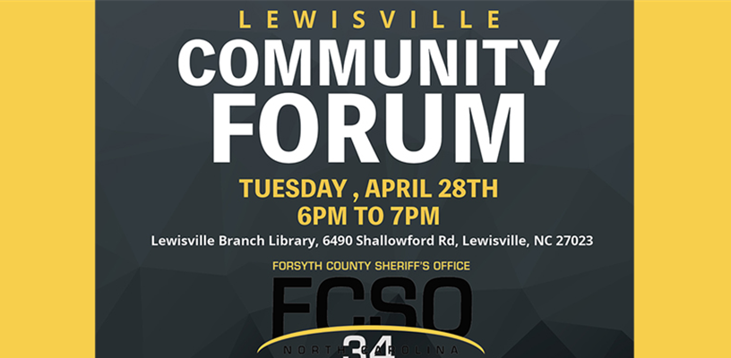 Come to the FCSO Quarterly Community Forum and discuss what's on your mind! Bring your questions and come prepared to interact with Sheriff Kimbrough and the Forsyth County Sheriff's Office Command Staff. The Quarterly Community Forum will be held Tuesday, April 28th from 6 to 7pm in the Auditorium of the Lewisville Branch Library located at 6490 Shallowford Road in Lewisville. You do not have to be a Lewisville resident to attend - all community members are welcome!