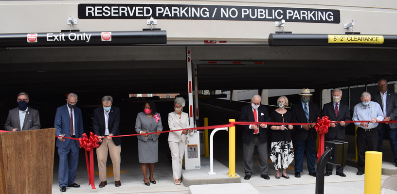 The ribbon was cut on a parking deck that was jointly funded by Forsyth County and the City of Winston-Salem on Thursday, August 20. The new parking deck represents the first step in the construction of Forsyth County’s new courthouse.