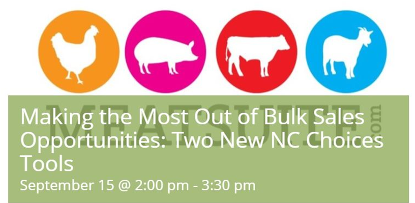 Are you looking for ways to get more out of bulk meat sales? Do you want to know about new tools to help you do it? Join the “Making the Most Out of Bulk Sales Opportunities” webinar, presented by NC Choices on September 15, 2020, 2–3:30 p.m. The webinar will introduce the Meat Price & Yield Calculator, an easy-to-use online tool to test and adjust prices and ensure a profit whenever you sell meat. During the webinar, you’ll also learn about adding your farm to the MeatSuite directory of North Carolina farms that sell meat in bulk quantities. Learn more and register online here..