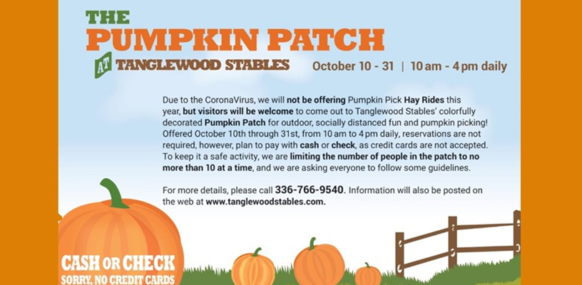 The Tanglewood Stables will be offering a pumpkin patch this year starting October 10th through October 31st from 10AM-4PM. Reservations are not required. Please plan to pay with cash or check, credit cards are not accepted. To keep it a safe activity, we are limiting the number of people in the patch to no more than 10 at a time. For more details and information, please call 336.766.9540 or visit www.tanglewoodstables.com.