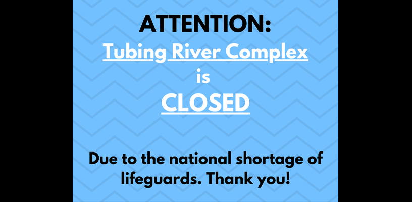Due to the national shortage of lifeguards and for your safety, the Tubing River Complex will be closed until further notice. Because of the lifeguard shortage, we will be operating at a reduced capacity. Our hours of operation are as follows: