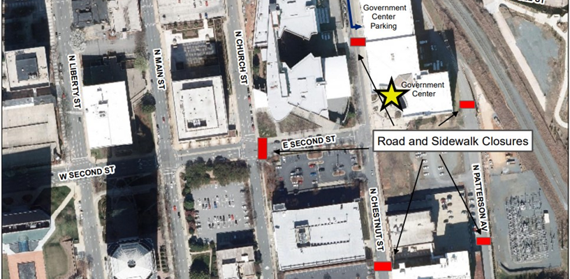- Chestnut Street between 1st Street and the 2nd Street Government Center parking deck entrance. The entrance to the parking deck is open.