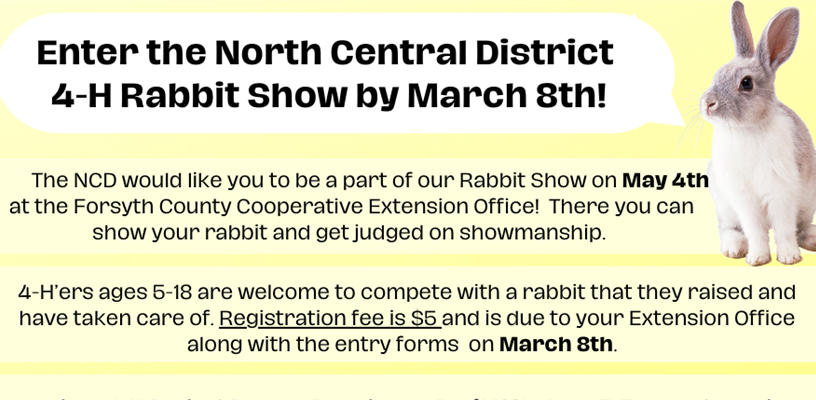 The North Central District would like you to be a part of our Rabbit Show on May 4th at the Forsyth County Cooperative Extension Office! There you can show your rabbit and get judged on showmanship.
