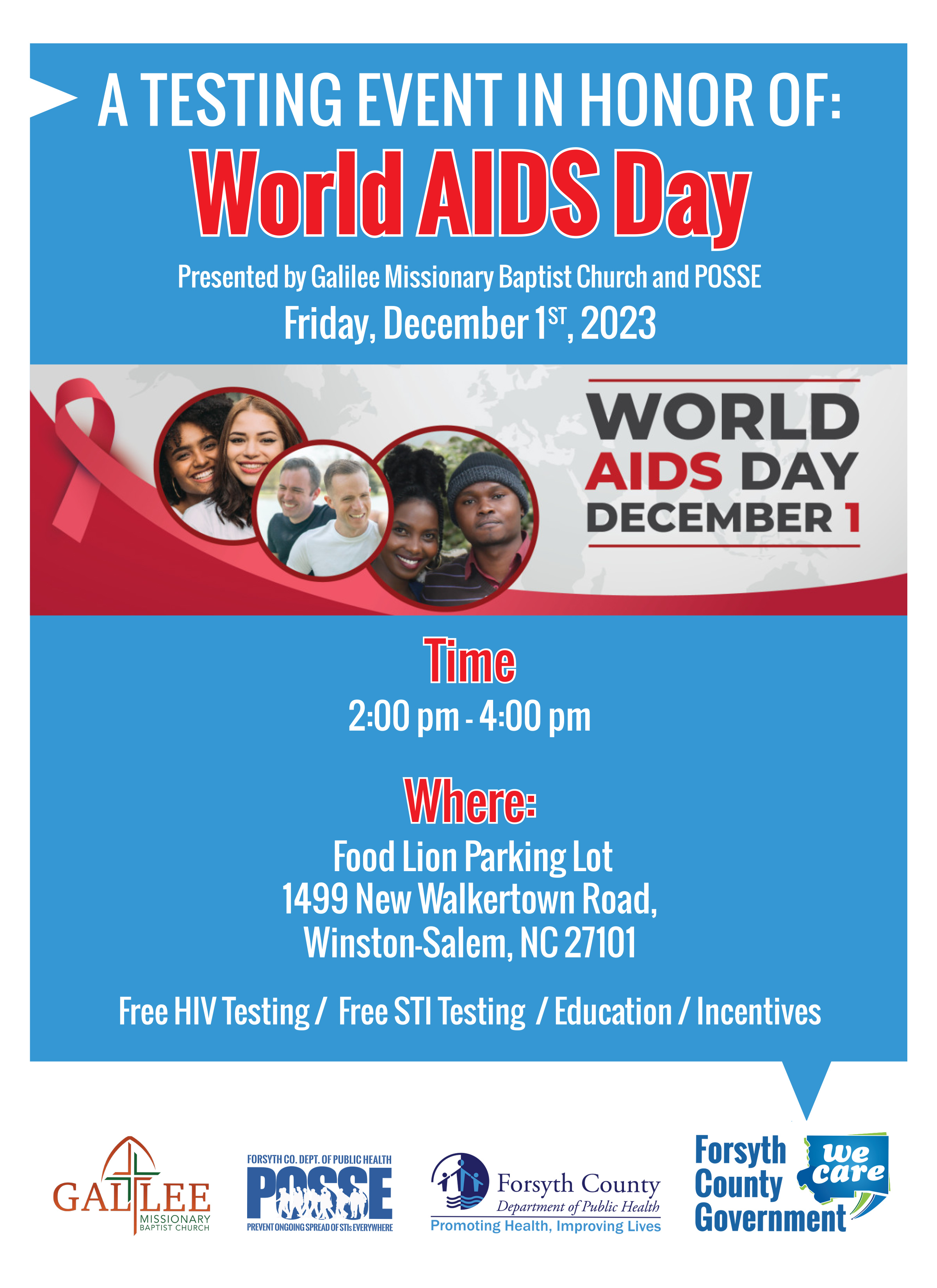 Forsyth County Department of Public Health is partnering with Galilee Missionary Baptist Church for a testing event in honor of World AIDS Day on Friday, Dec. 1 from 2-4 p.m. at Food Lion, 1499 New Walkertown Road.