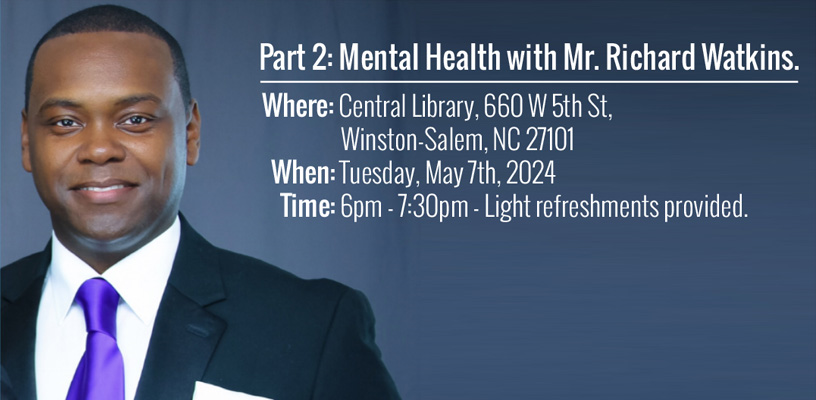 Our Men's Health Program will hold its next "Men Talk Too!" on May 7 from 6-7:30 p.m. at the Central Library, 660 W. 5th Street. The speaker will be Richard Watkins, Coordinator of Counseling Services at Forsyth Technical Community College. Light refreshments will be served. Bring your questions and let's talk mental health!