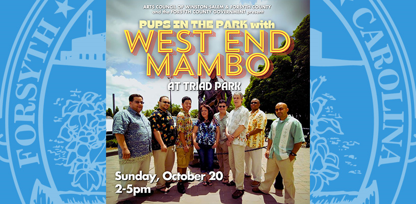 Arts Council's final event in the 9th Annual Parks Concert Series is Pups in the Park with West End Mambo on Sunday, October 20 from 2-5pm. The event series, presented in partnership with Forsyth County Government, provides free, family-friendly concerts showcasing local and national musicians in beautiful outdoor venues.