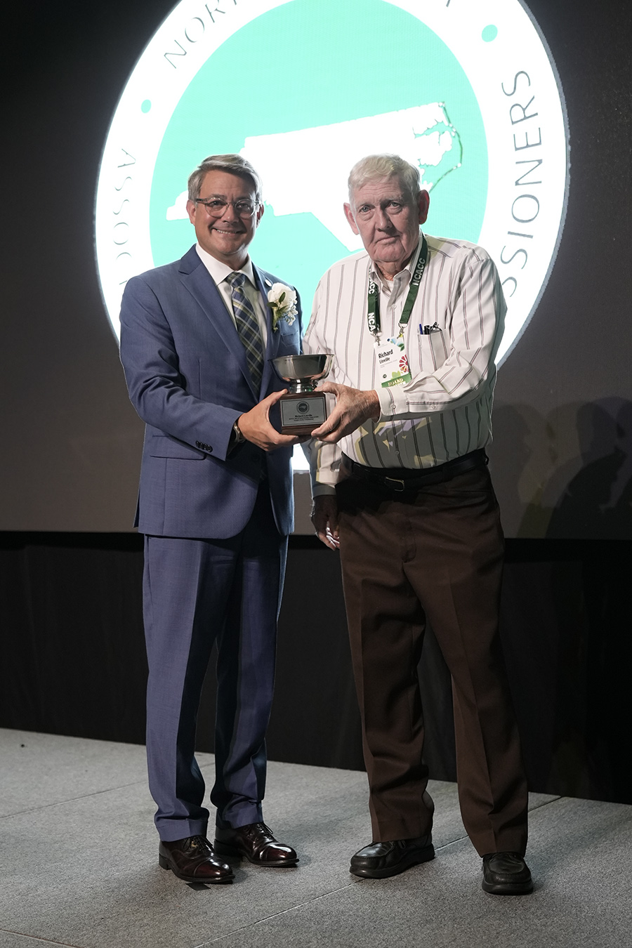 NCACC Executive Director Kevin Leonard gives Forsyth County Commissioner Richard Linville a Hall of Fame recognition.