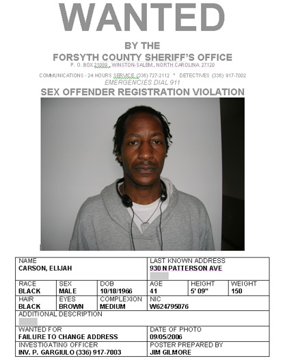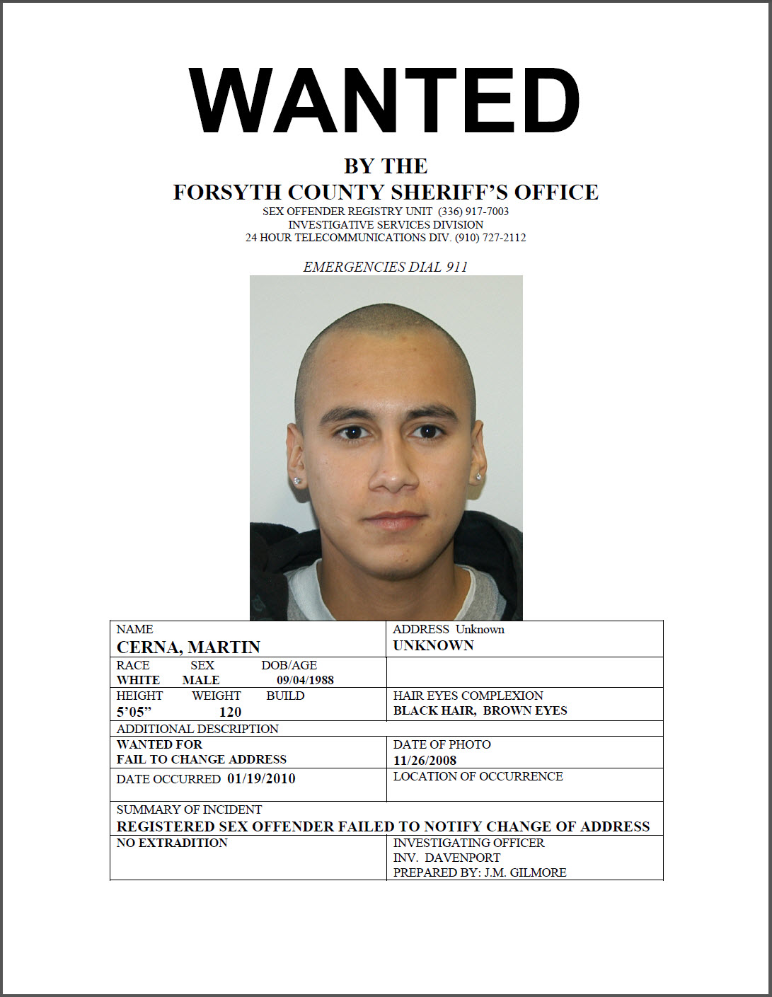 The following persons are wanted by the Forsyth County Sheriff's Office. These persons are listed as sex offenders and have failed to register or maintain their address and/or have given false information. If you know the whereabouts or have any information on these individuals, please contact the Forsyth County Sheriff's Office or your local law enforcement agency. Do not attempt to apprehend any of these individuals.
